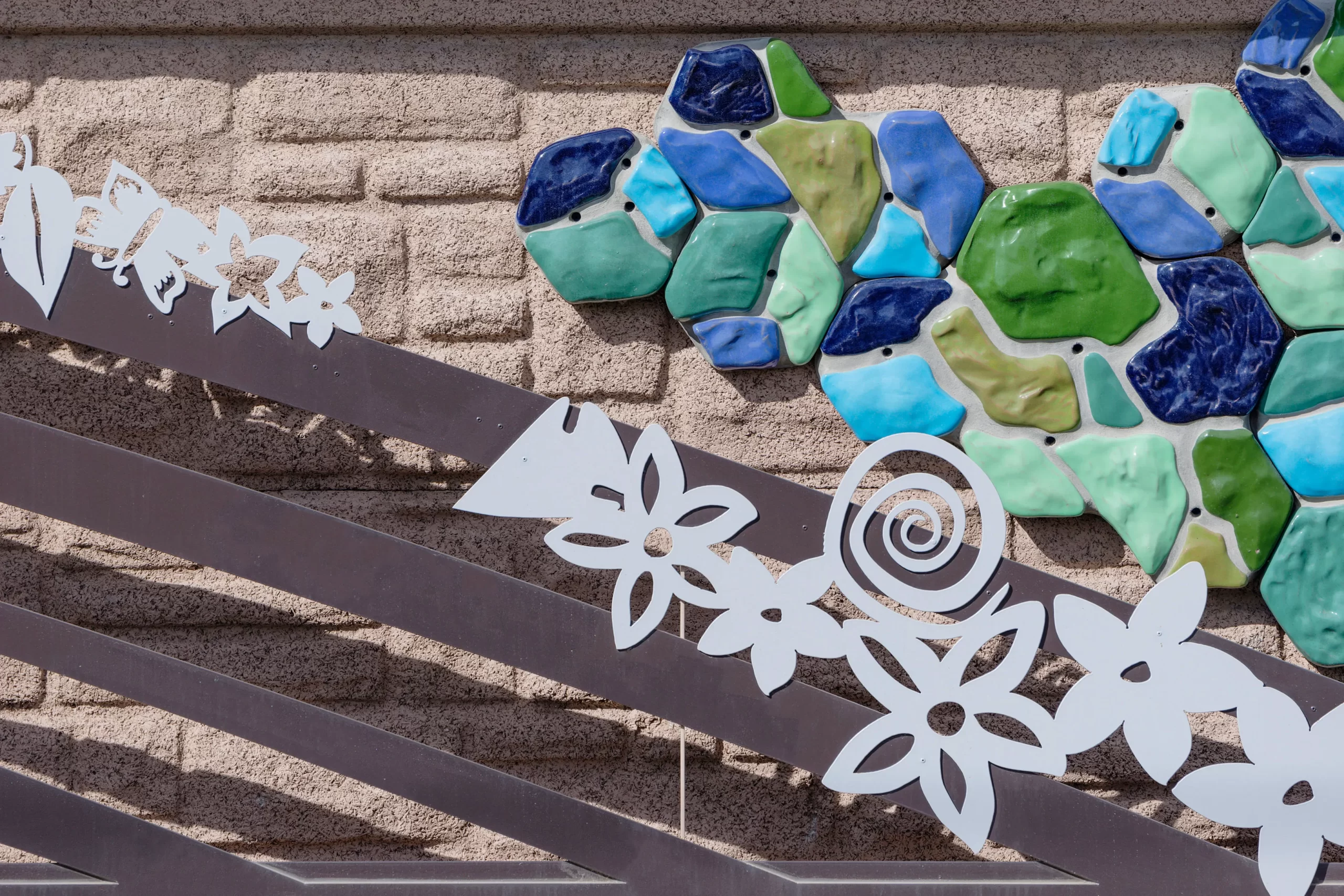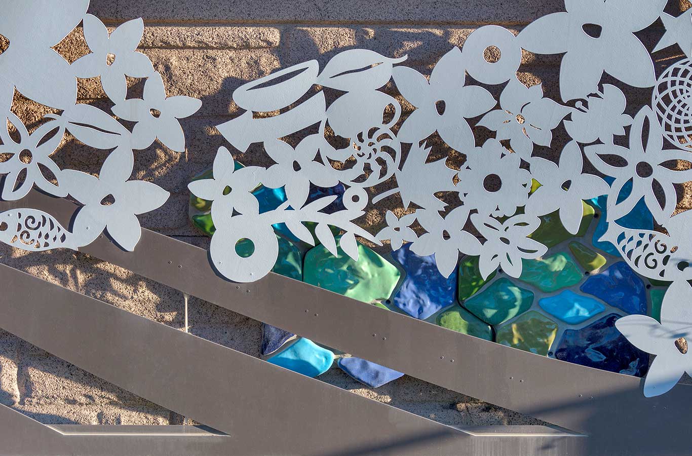 The community engagement aspect of the project not only contributed to the creation of a beautiful and meaningful installation but also helped to strengthen community ties and promote cultural understanding. The materials used in the screen mural were carefully selected based on the creative input generated during the experiential learning workshop. The incorporation of these not only highlights the diverse and collaborative nature of the project but also enhances the overall aesthetic and layered sensory experience of the installation. The resulting artwork is a testament to the many benefits of collaborative design processes and community engagement.