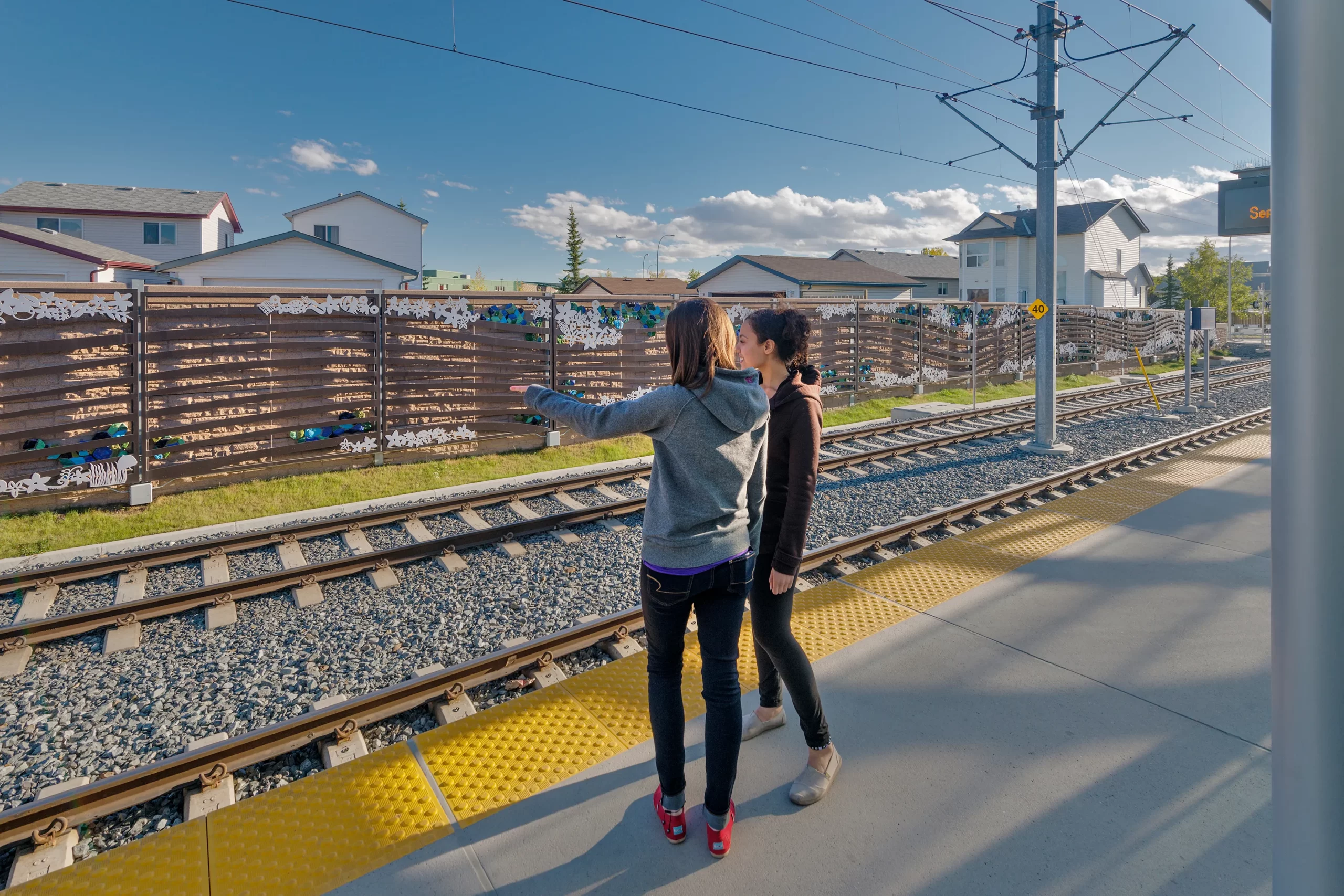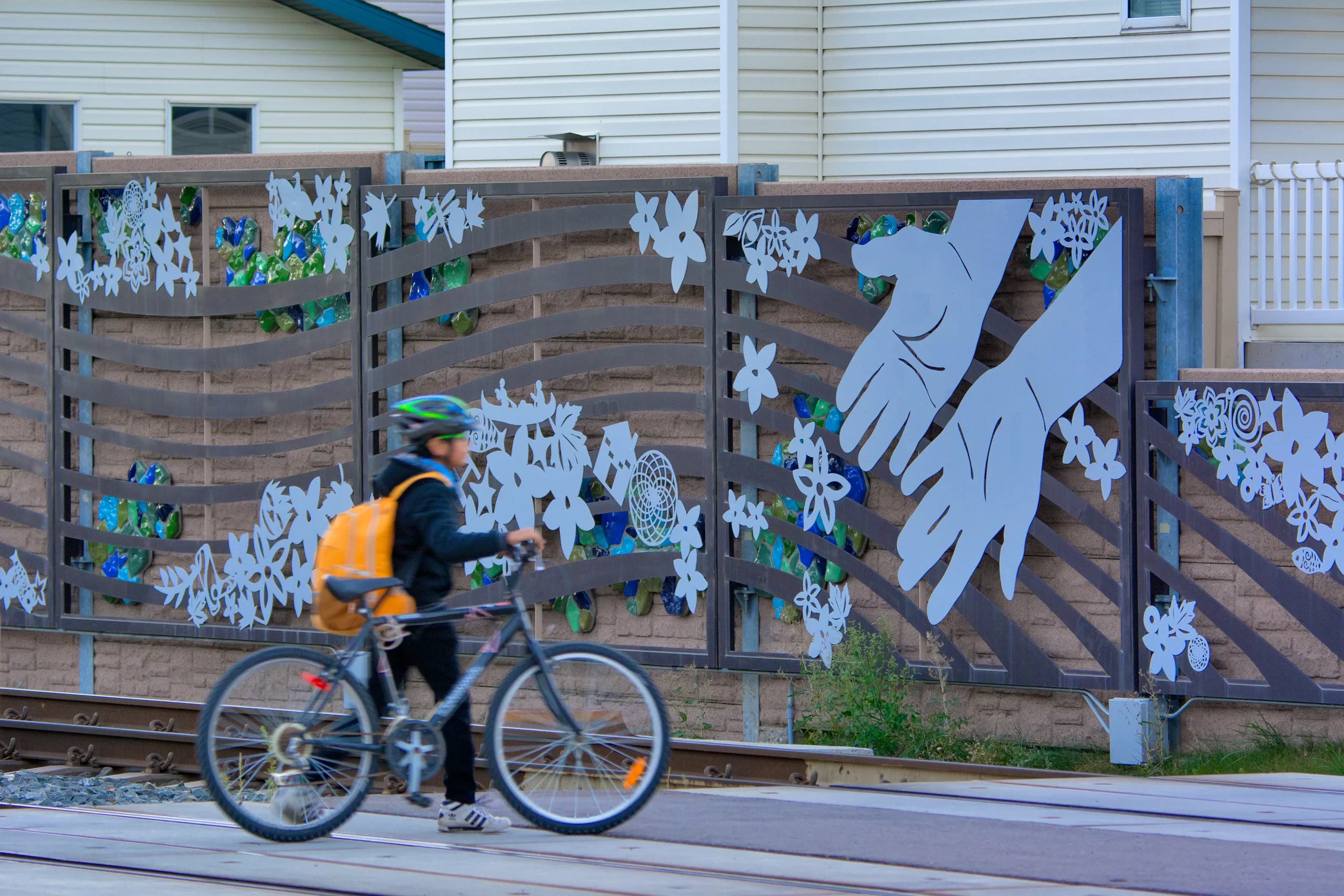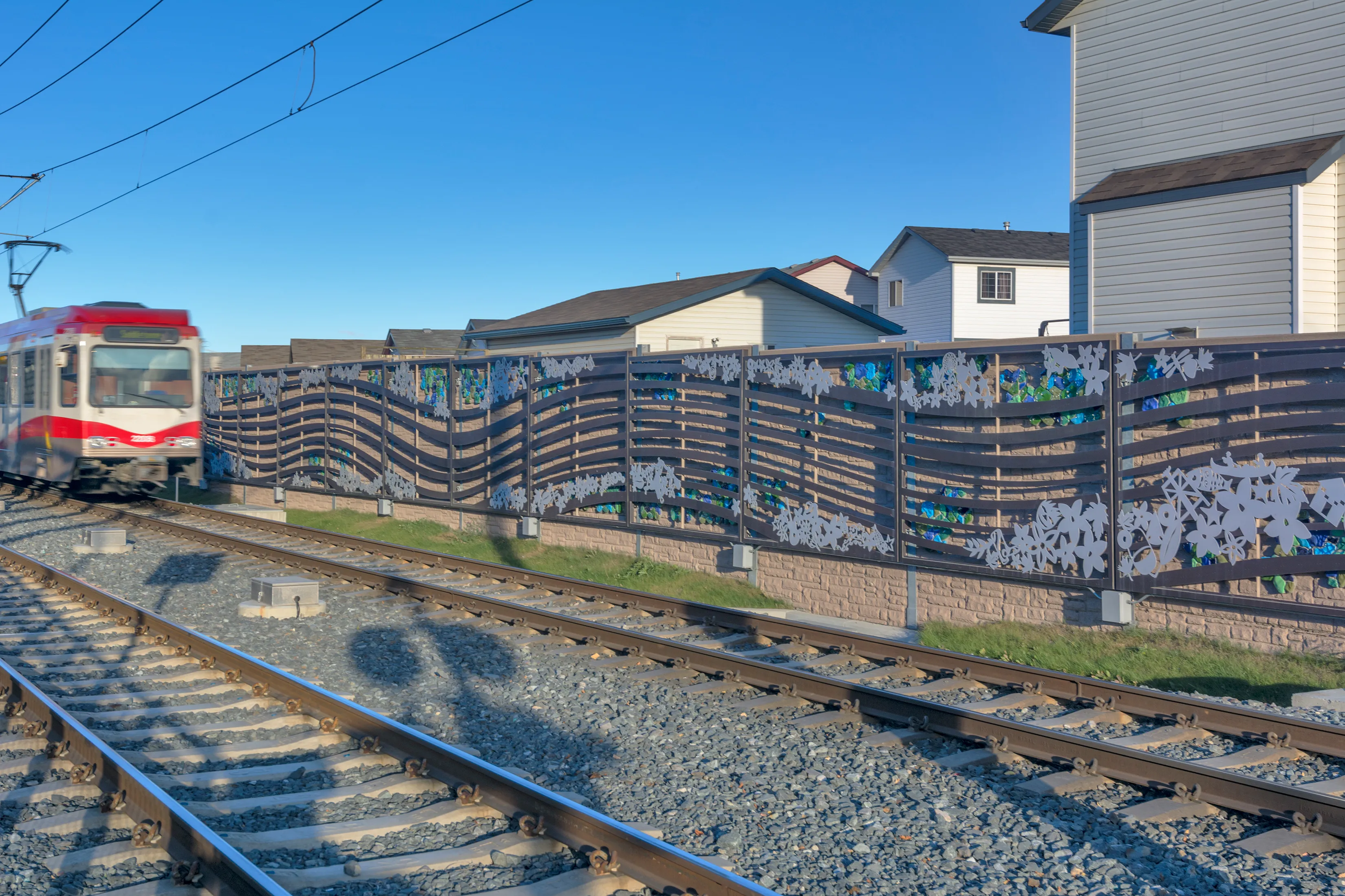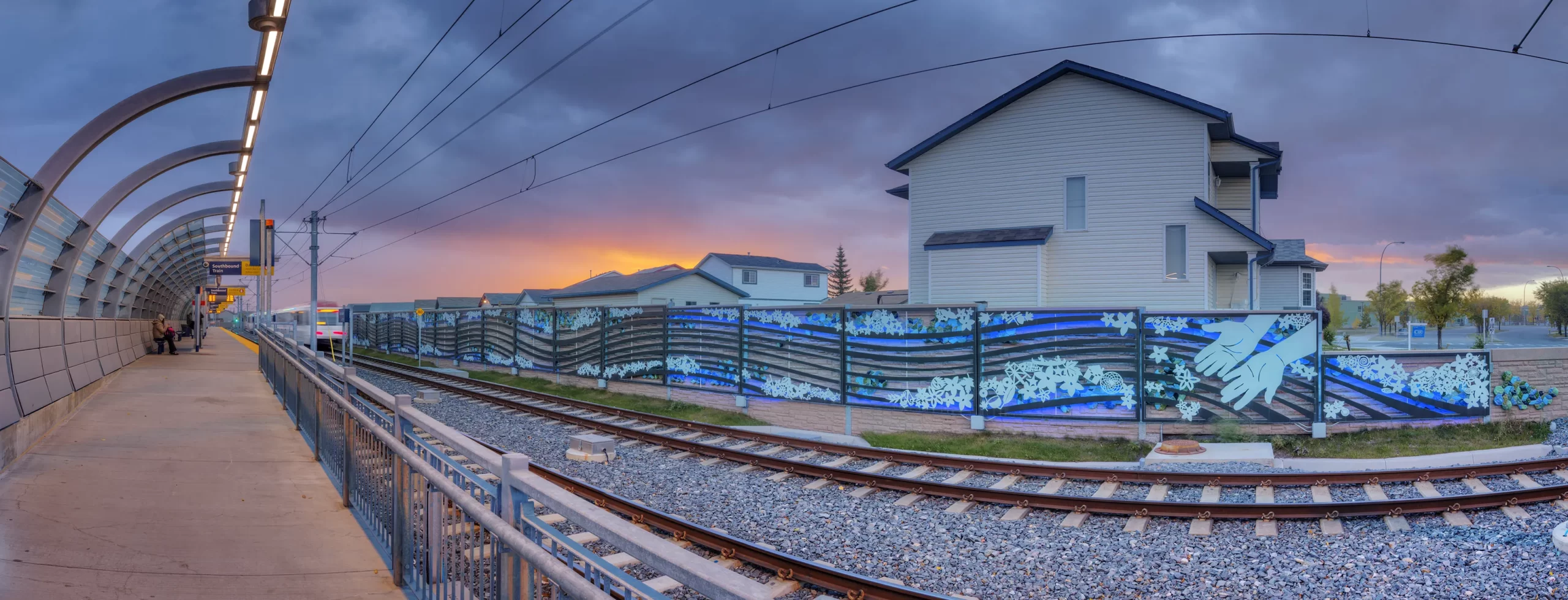 At the Martindale LRT Station, a site-specific and sculptural installation was created to provide a meaningful experience for commuters by interweaving physical and symbolic elements of Calgary’s rivers and the Ganges. To encourage community engagement, an experiential learning workshop was established that explored the cultural significance of the area, with a focus on the rich history of the Punjabi community in the region. Students were inspired to imagine traditional symbols of Punjabi and Calgary culture that would float in the linear “river” of the installation.